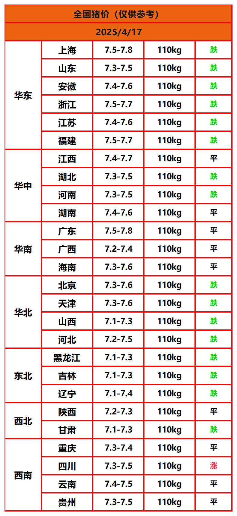 2025年4月17日猪价,今日全国猪价行情走势:1涨9平16跌。
