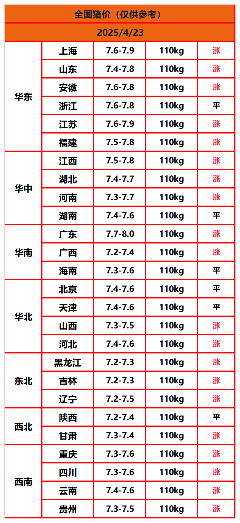 2025年4月23日猪价,今日全国猪价行情走势:20涨6平0跌。