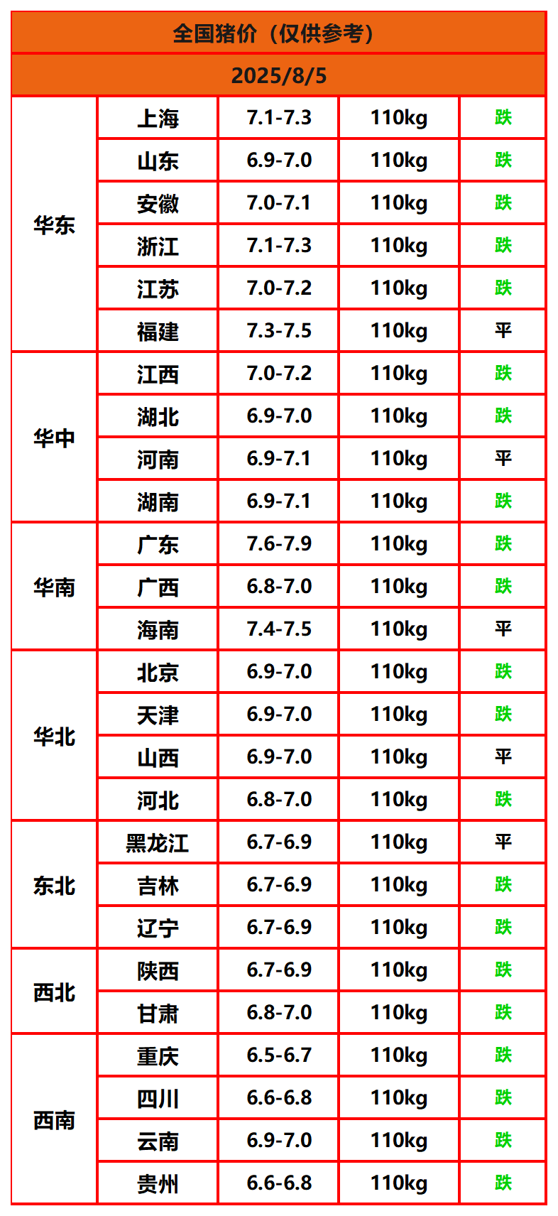 2025年8月5日猪价,今日全国猪价行情走势:0涨5平21跌。