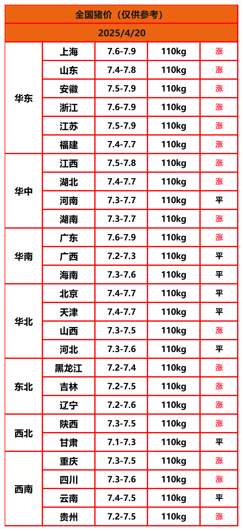 2025年4月20日猪价,今日全国猪价行情走势:18涨8平0跌。