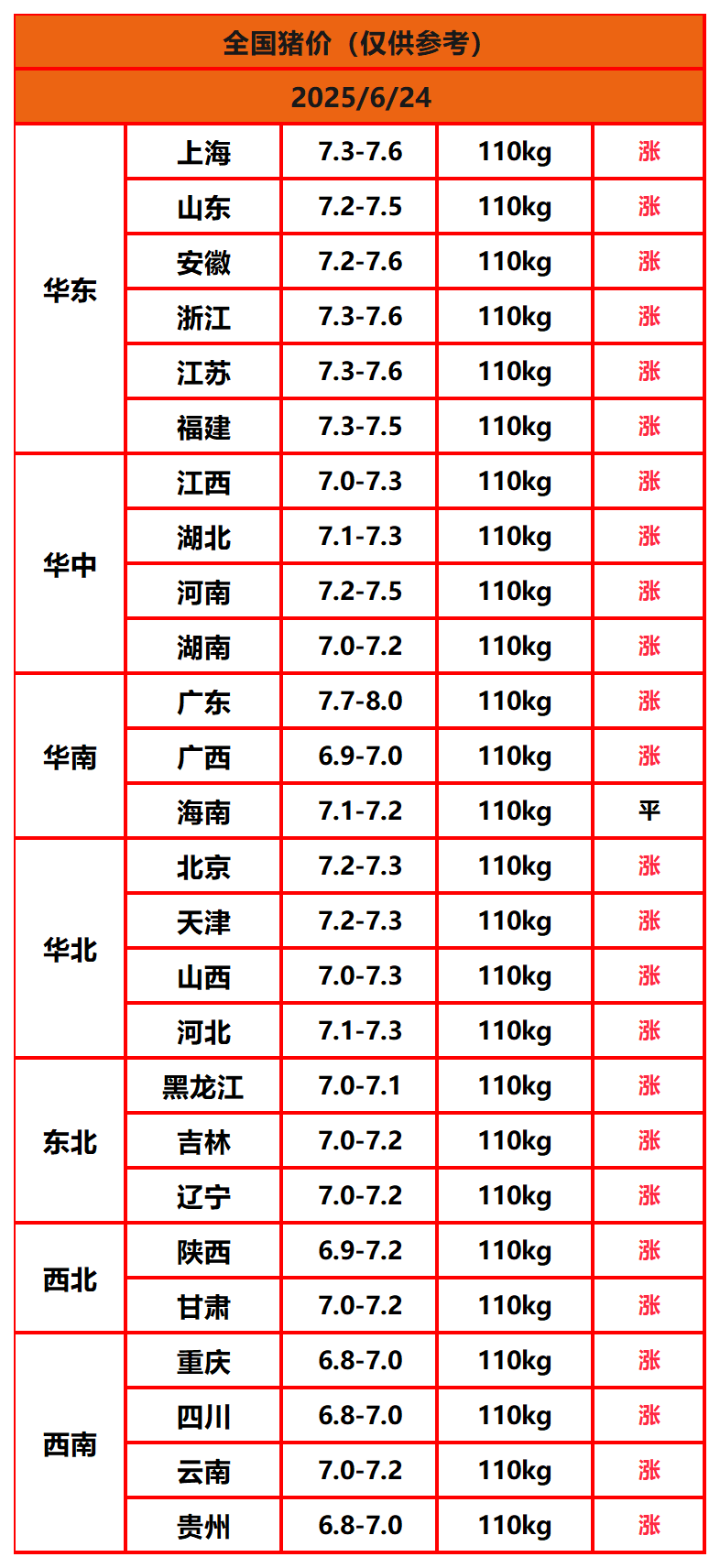 2025年6月24日猪价,今日全国猪价行情走势:25涨1平0跌。